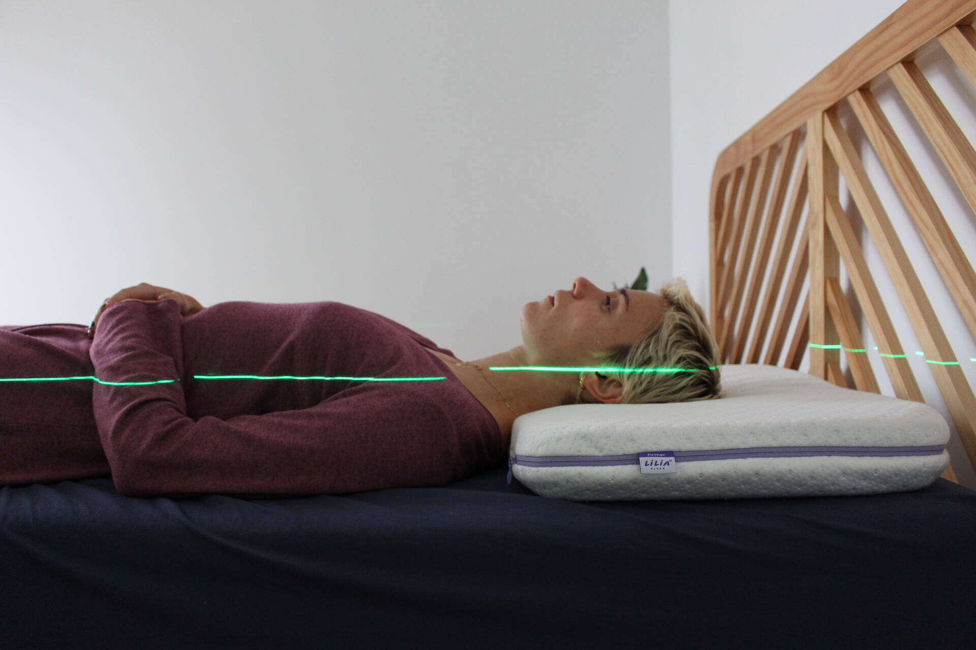 Schläfst Du auf dem Rücken? Dann brauchst Du ein niedrigeres Kissen als beim Seitenschlaf – aber ein höheres, als wenn Du auf dem Bauch liegen würdest.